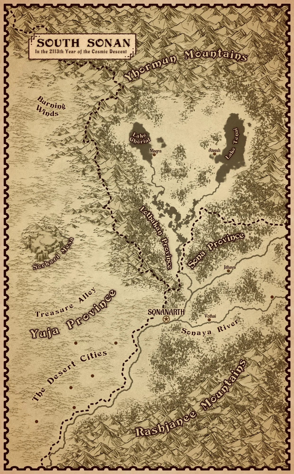 Sona: The largest province of Sonan. It contains Sonan’s capital city, Sonanarth. Though Sona Province borders the desert to the west, it primarily consists of verdant farms, fields, and forests, stretching far to the east.